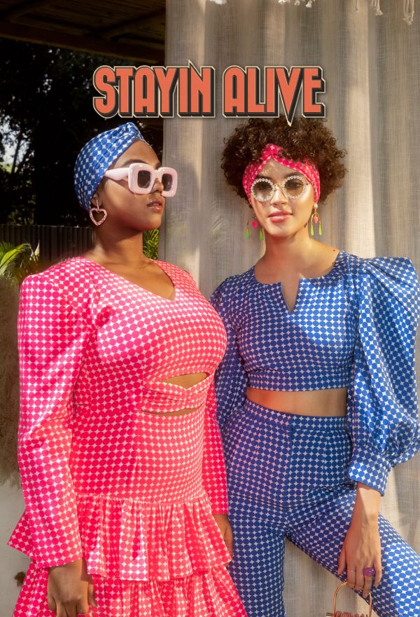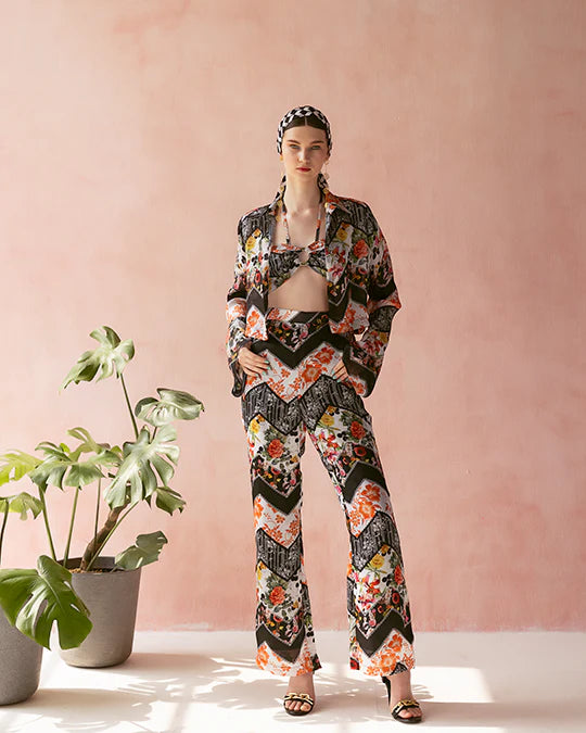 Printed coord set- ring bustier, with pants & cropped open shirt with flared sleeves