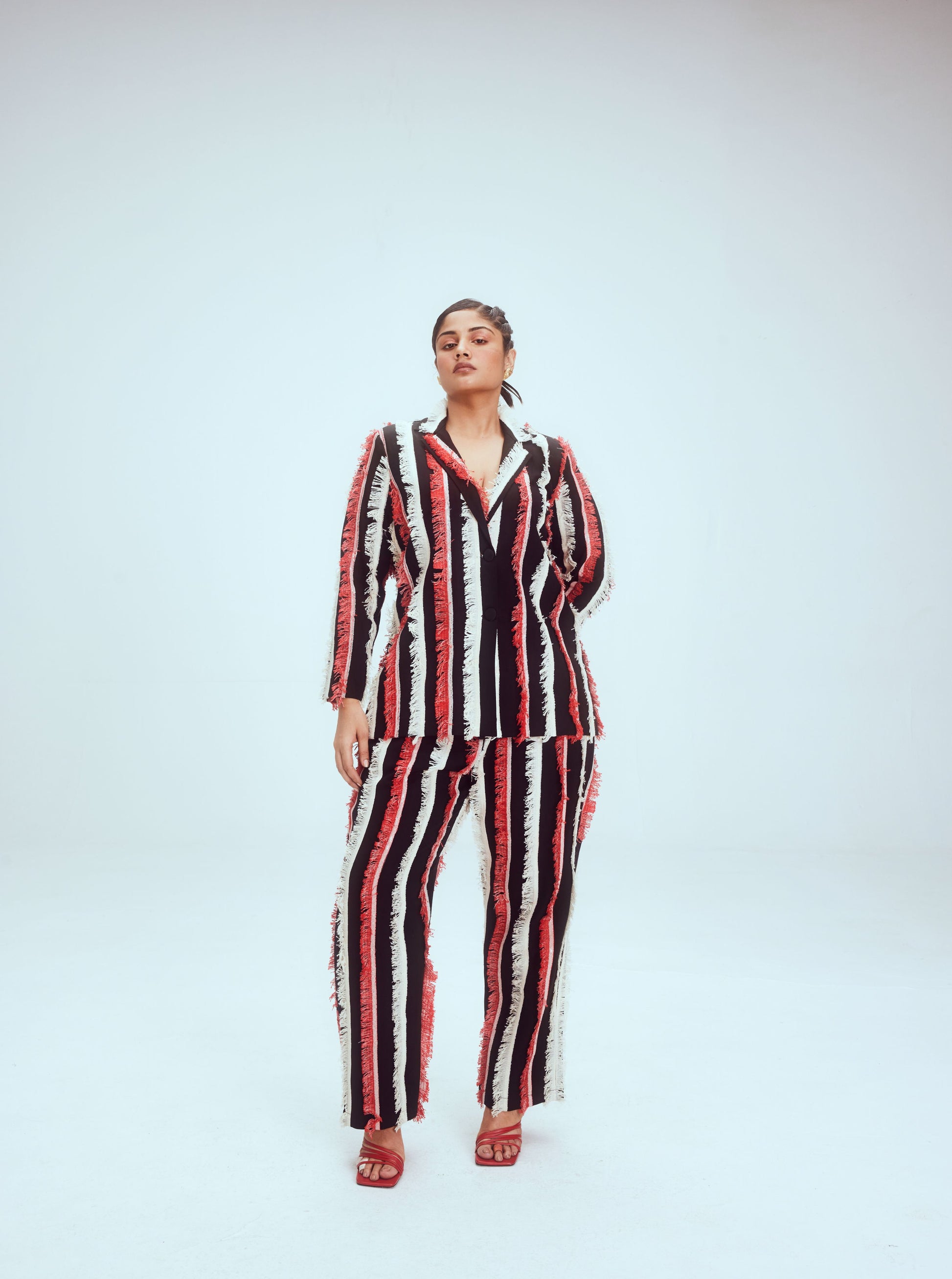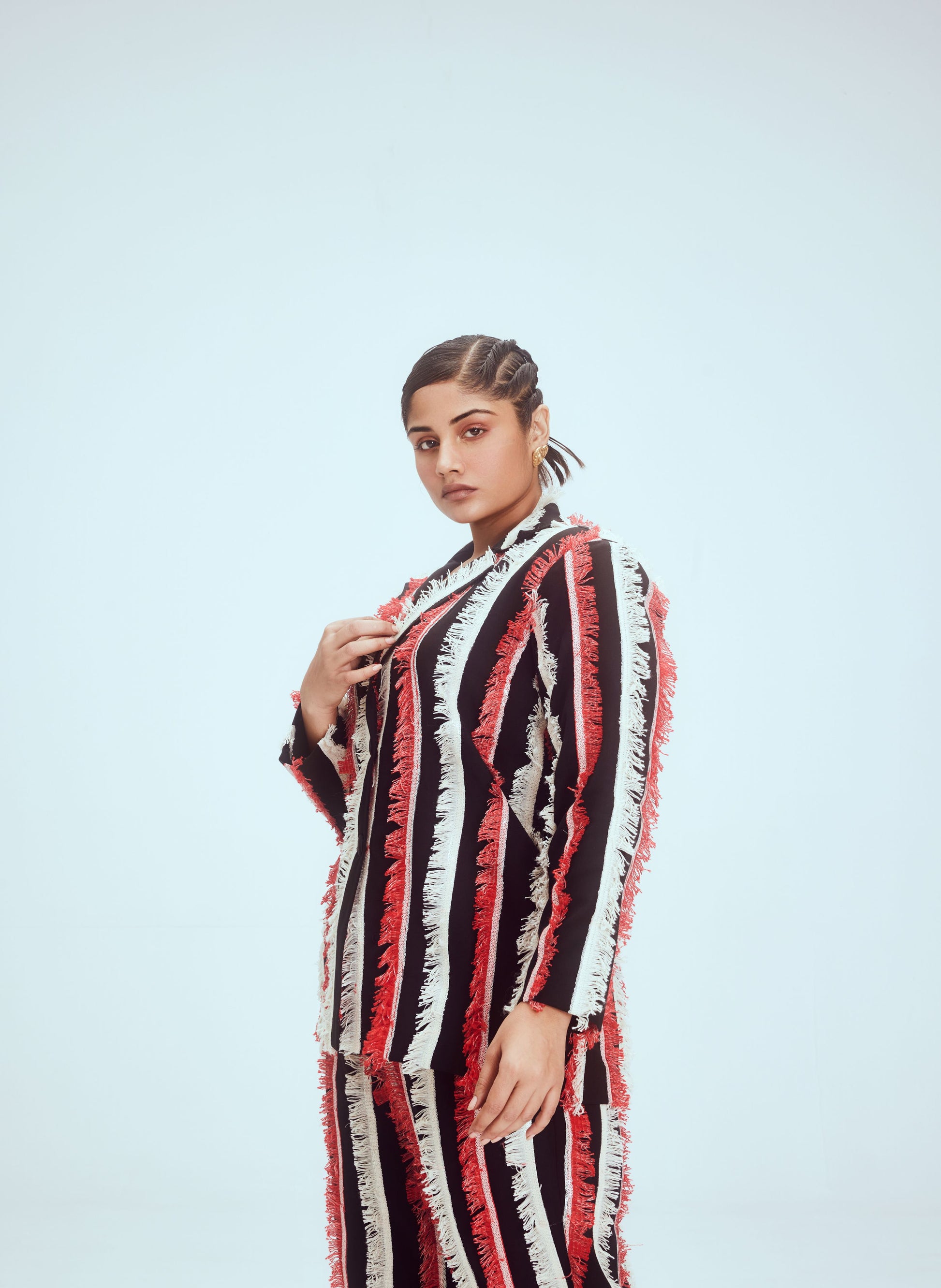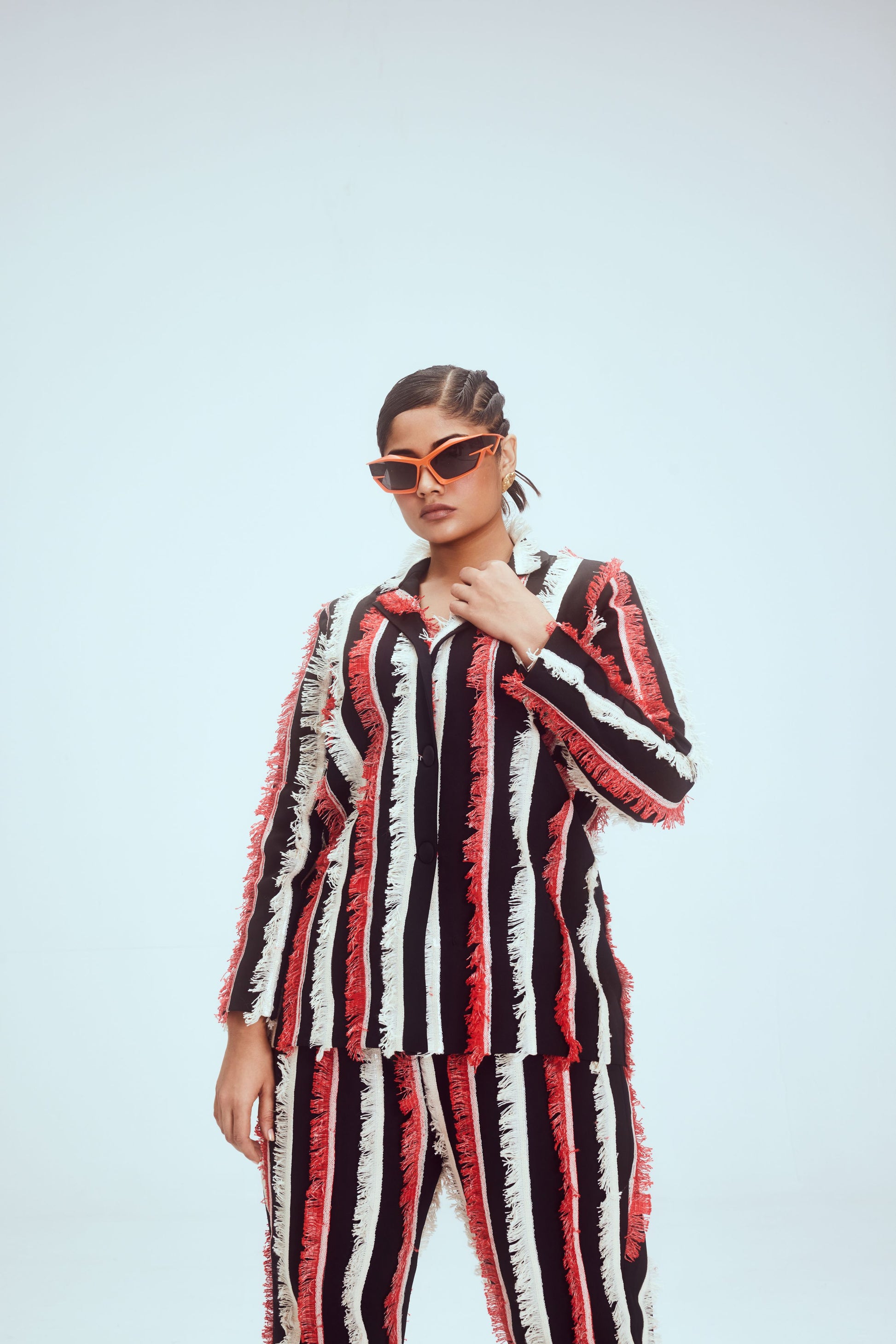The well structured pant suit has vertical fringe & sequin detailing all over.