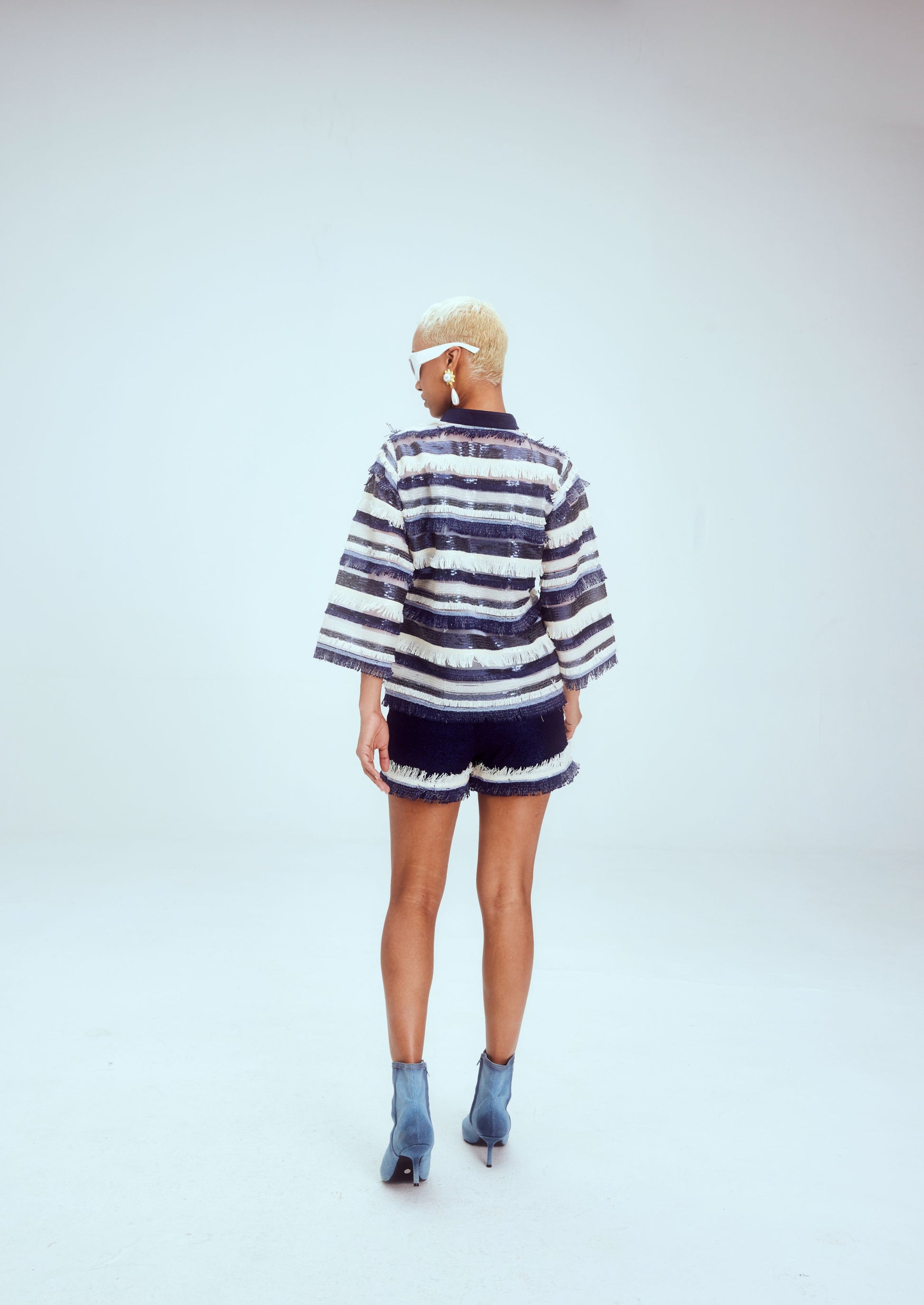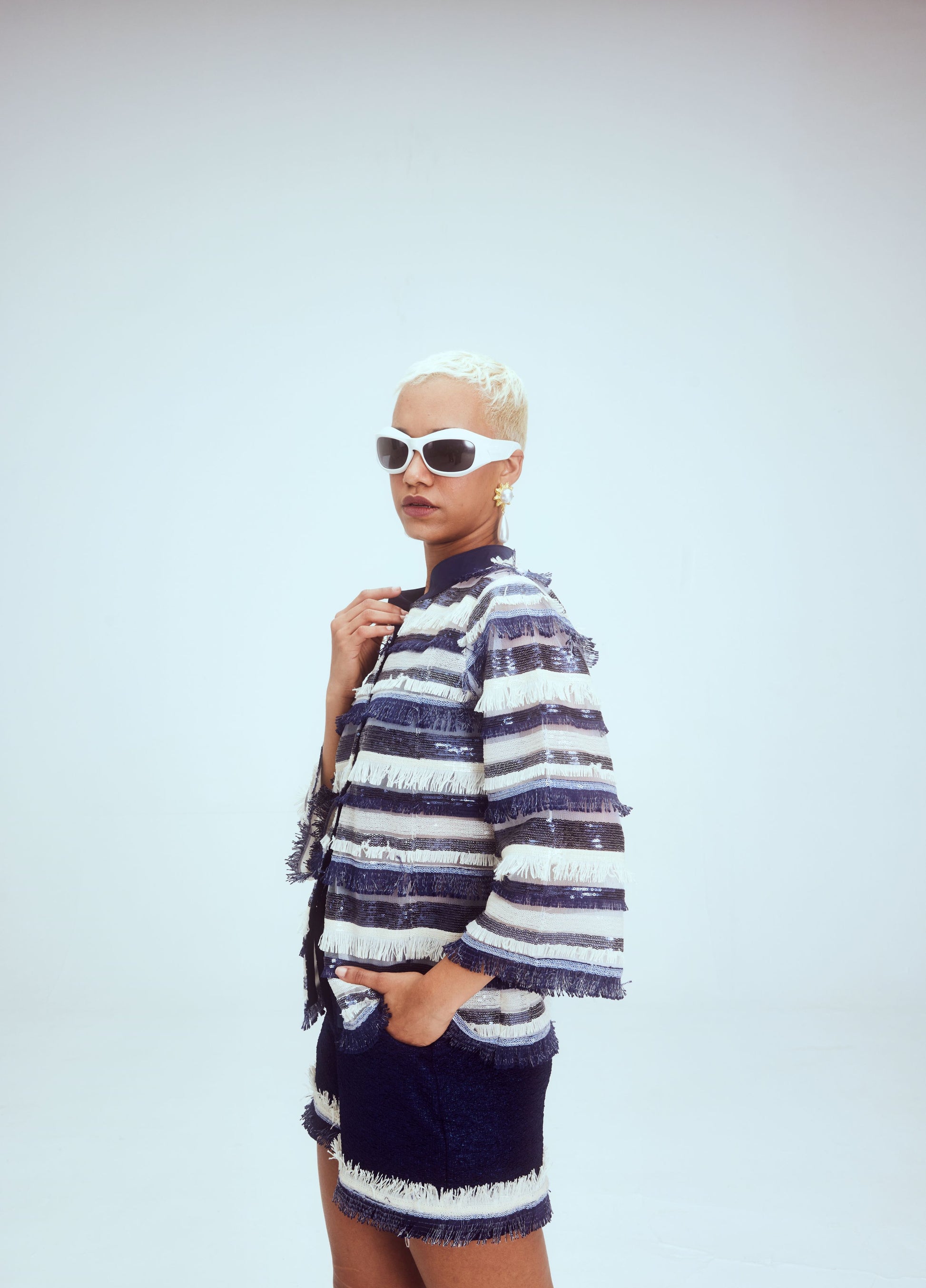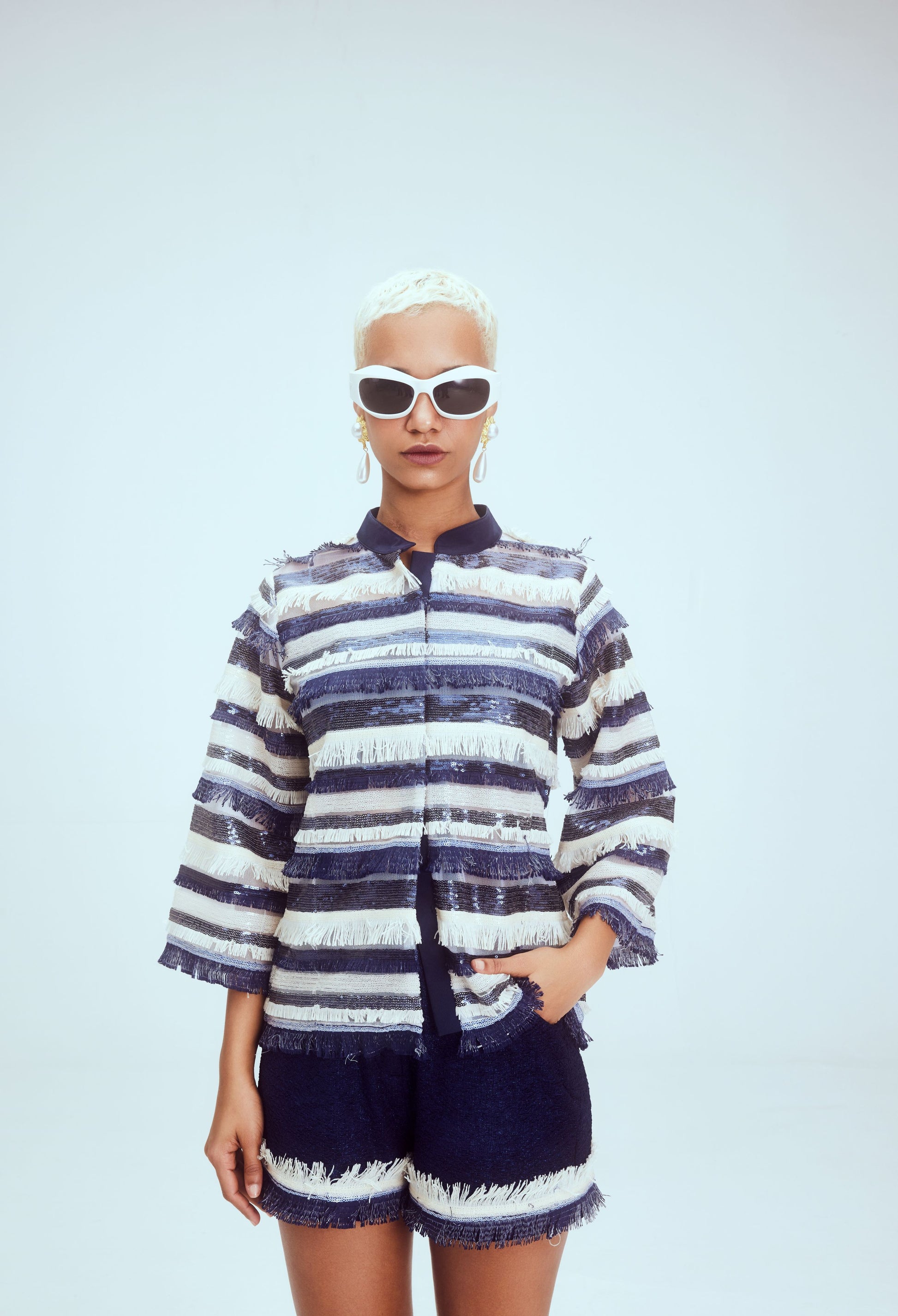 The quarter sleeve jacket has layers of fringes & sequins done together over net. It comes with an attached bustier lining. The matching crinkle lycra shorts has fringe & sequin detailing at the hem.