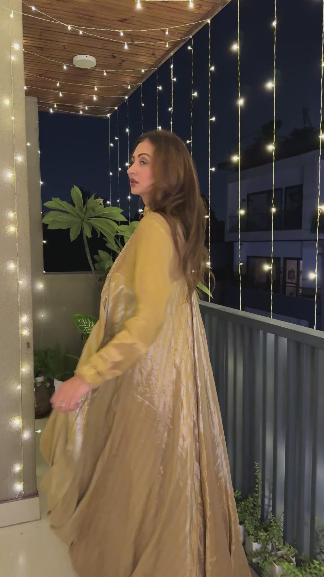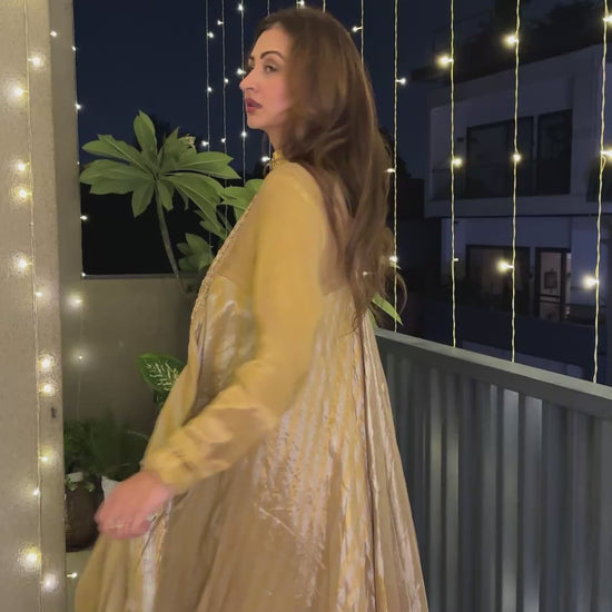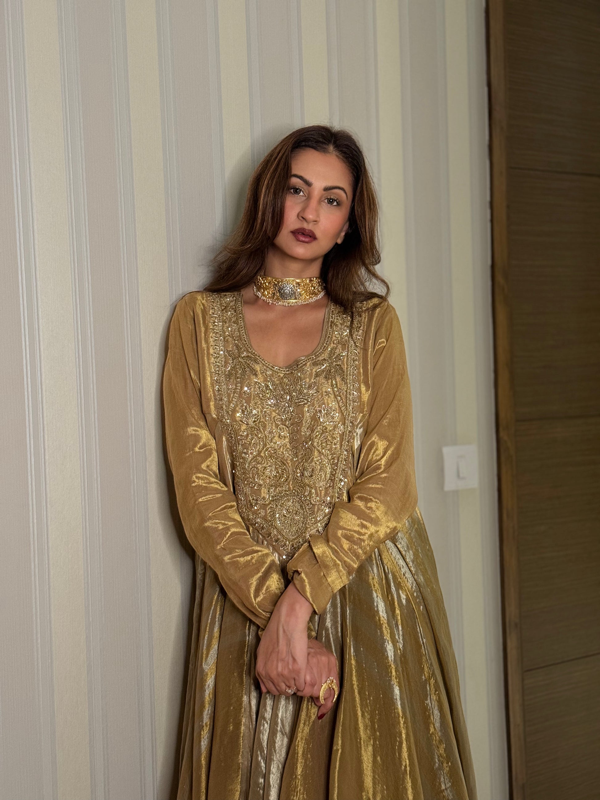 The Anarkali has beautiful dori embroidery on the neck that is hand embroidered with sequin and cut daana. It has a anti fit, which is less structured and has beautiful multi gold/silver shades.