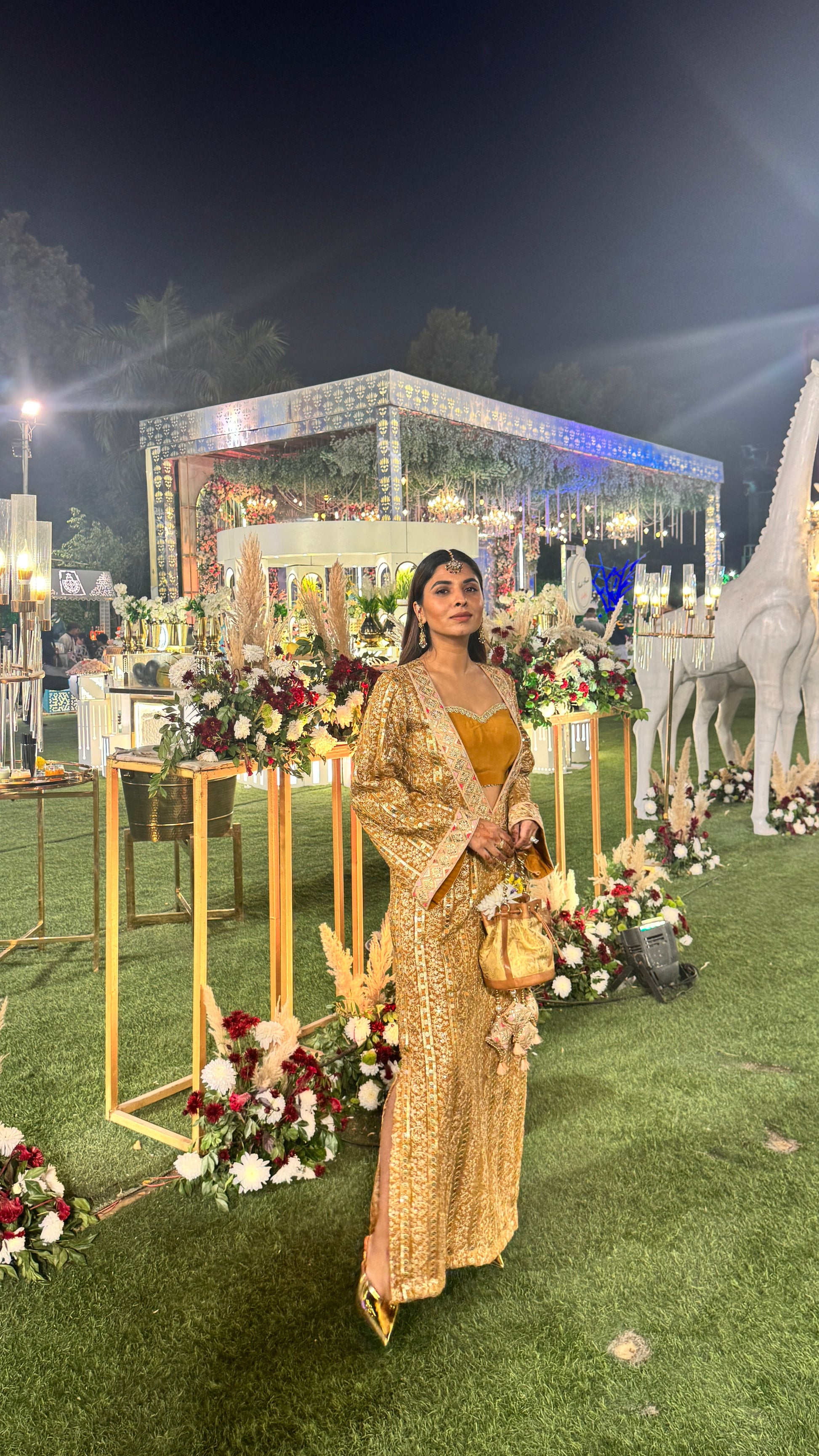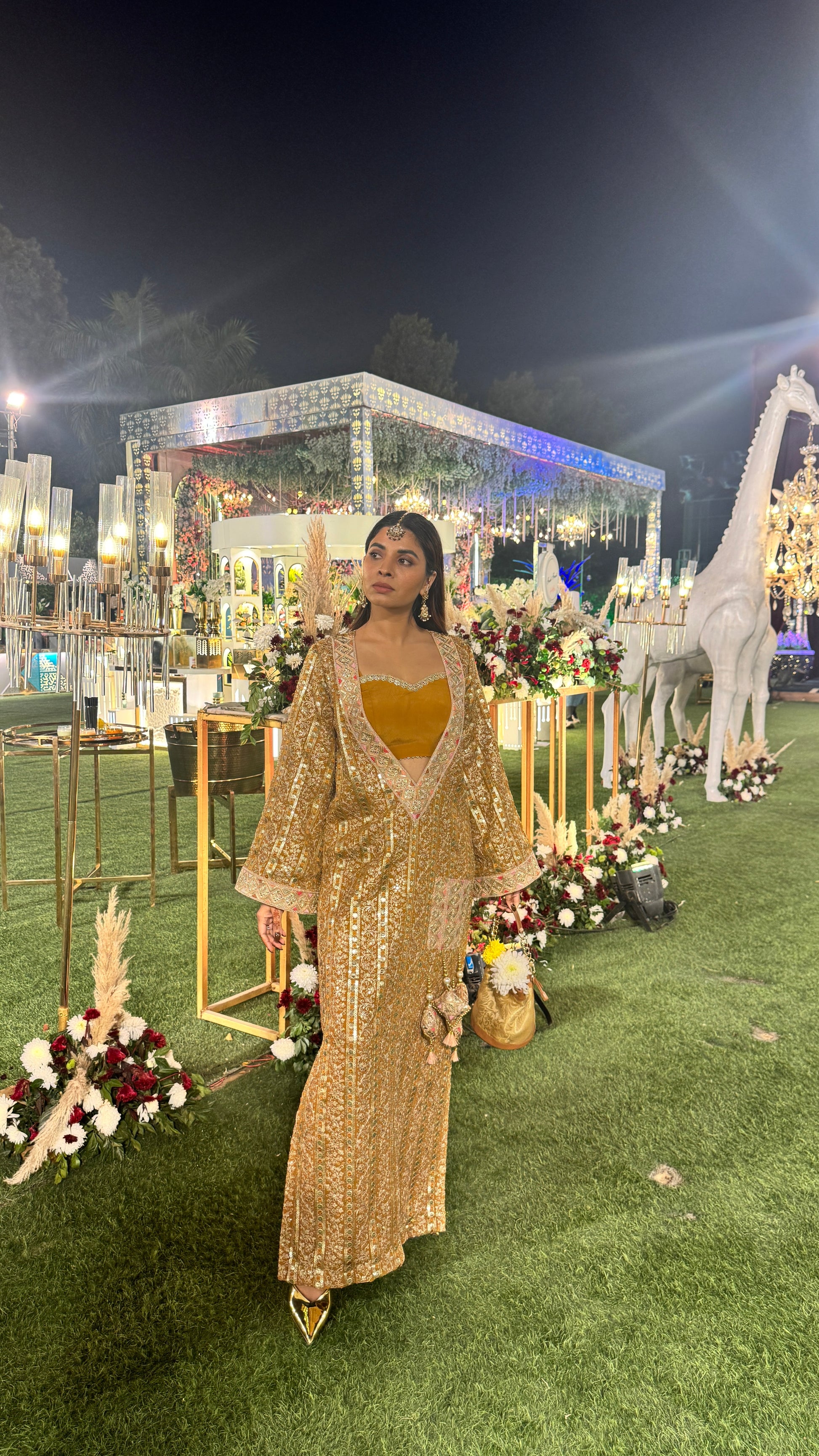 The cut sleeves tweed jacket has sequins all over. The silver detailing at the collar & flap of the pockets & crystal buttons add a touch of glamour to this tailored fit jacket.