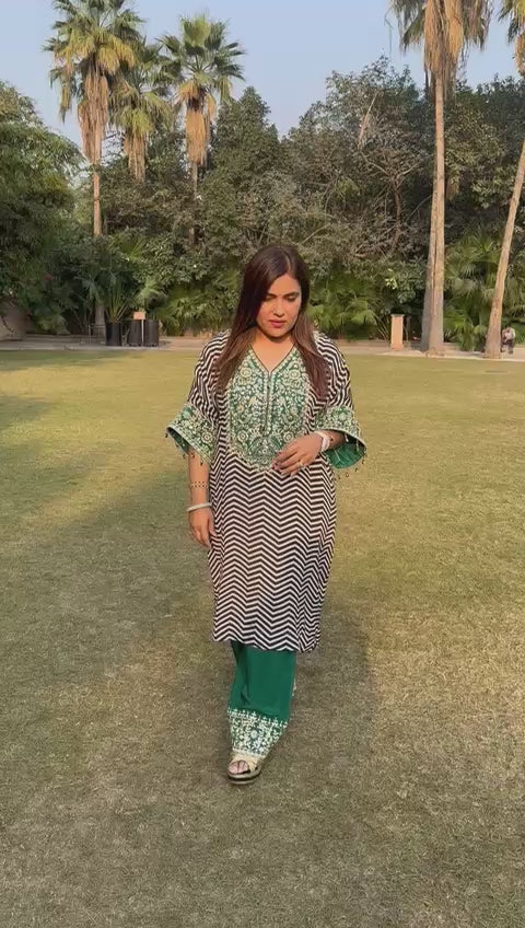 The v neck kaftan with bell sleeves along with coloured pants. It is adorned with machine dori embroidery, highlighted with pearls and stones by hand. The sleeves have beautiful tassel detailing.